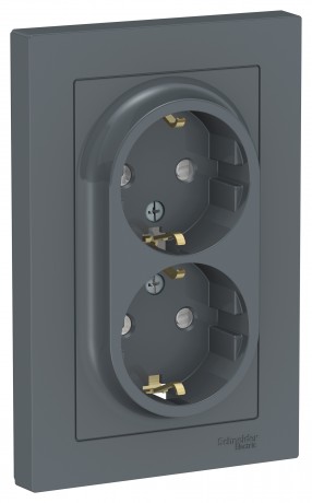 Розетка двойная Schneider Electric AtlasDesign (в сборе, цвет грифель) с заземлением, без шторок подходит для сетей 250 В, на ток 16 А.- Заземляющий контакт обеспечивает дополнительную защиту от удара электрическим током.- Лицевые детали из качественного ABS-пластика, устойчивого к царапинам и УФ-излучению.- Двойная розетка позволяет подключить два устройства в одном месте.- Изделие поставляется в комплекте с рамкой того же цвета.
